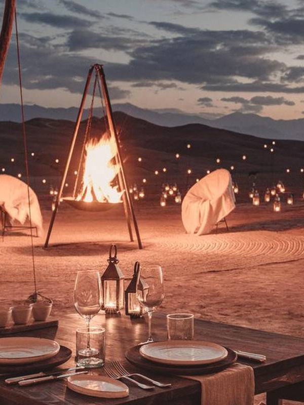 As the sun sets, gather around a campfire and savor a traditional Moroccan dinner under the stars. The evening continues with a lively show featuring belly dancing, fire-eating performances, and Gnawa music, creating a truly immersive desert atmosphere.